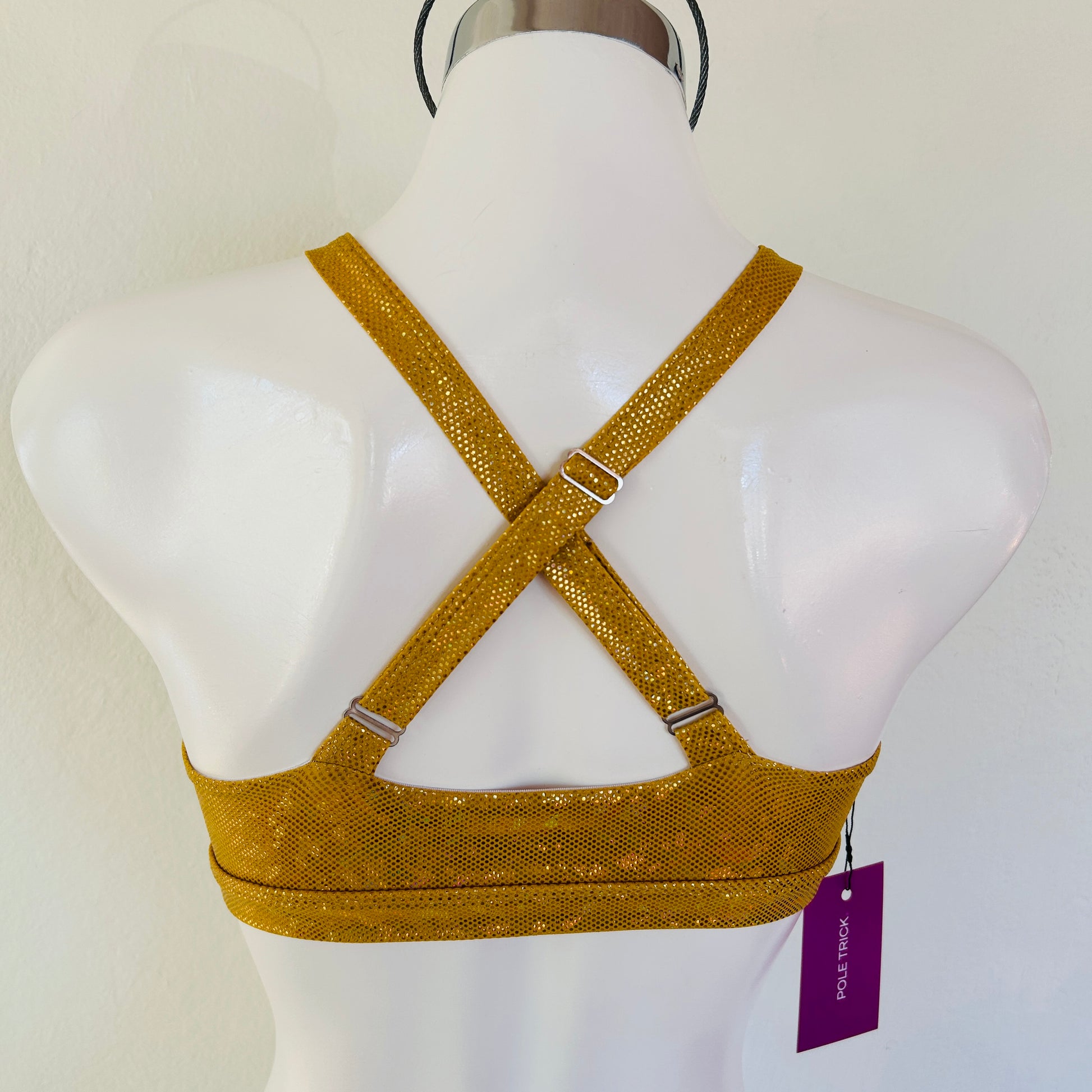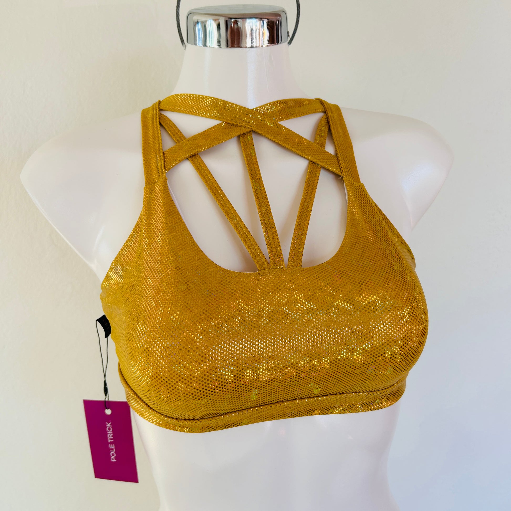 El Top Estrella combina el brillo iridiscente del acabado metálico con un diseño estructural de tiras que realza el pecho y brinda soporte firme.