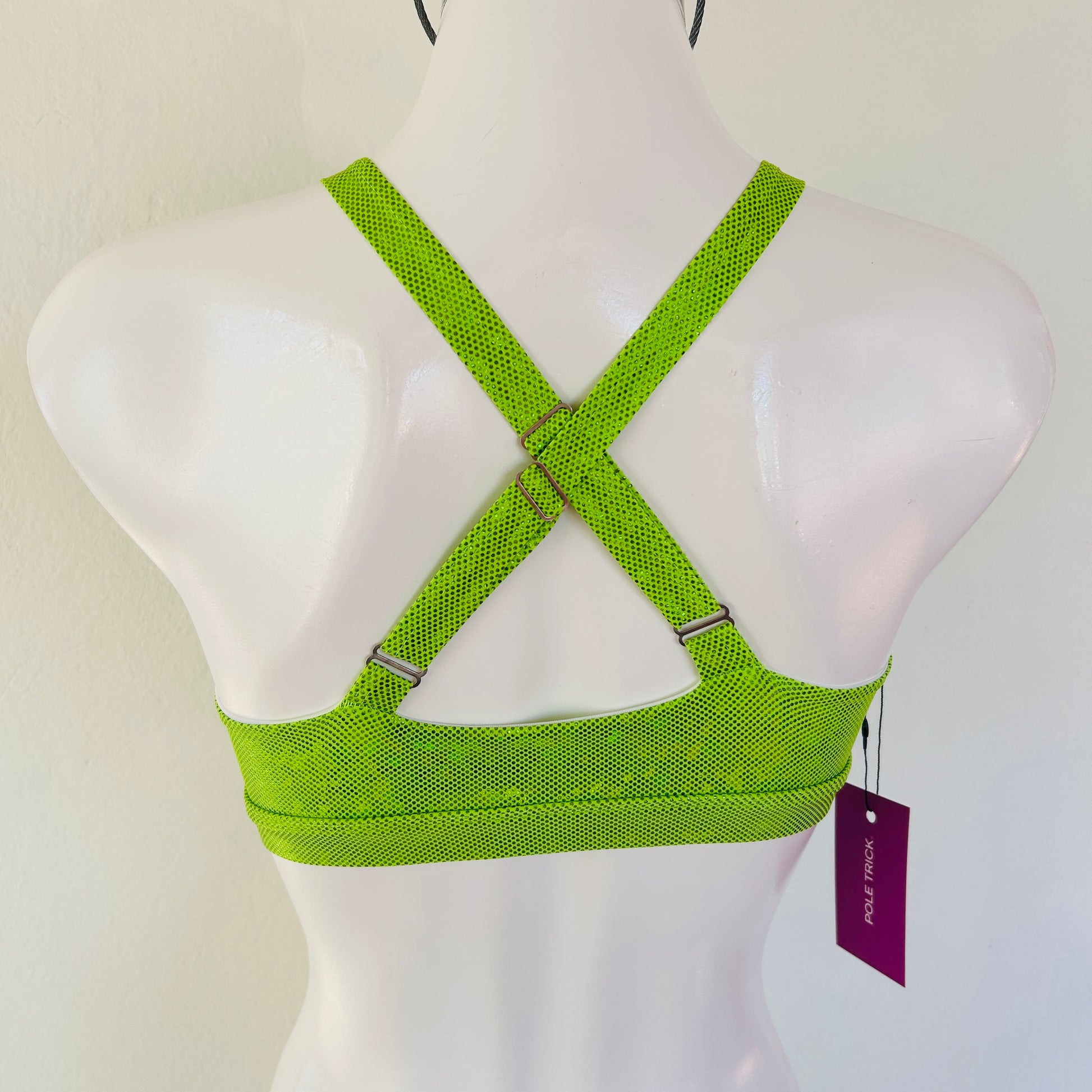 El Top Estrella combina el brillo iridiscente del acabado metálico con un diseño estructural de tiras que realza el pecho y brinda soporte firme.
