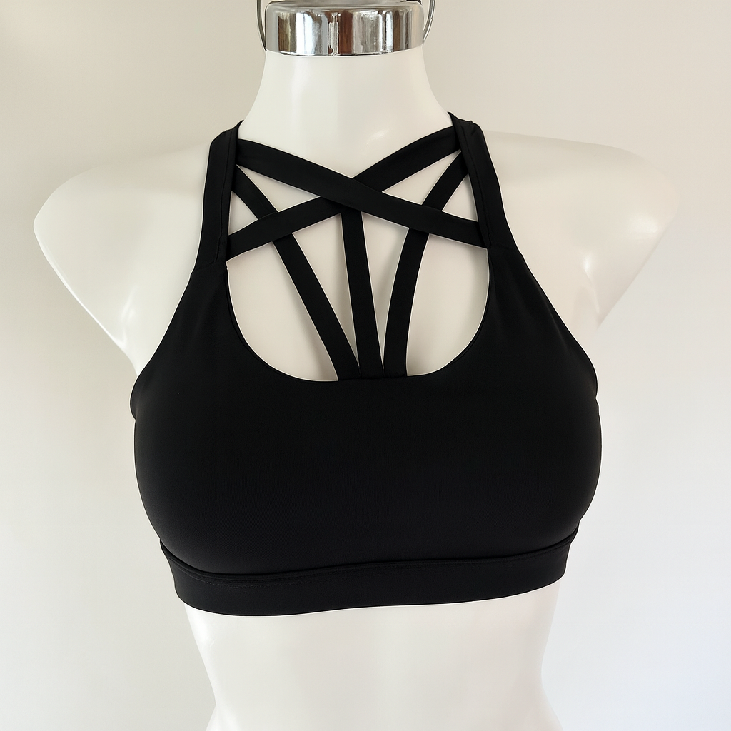 El Top Estrella combina el brillo iridiscente del acabado metálico con un diseño estructural de tiras que realza el pecho y brinda soporte firme.