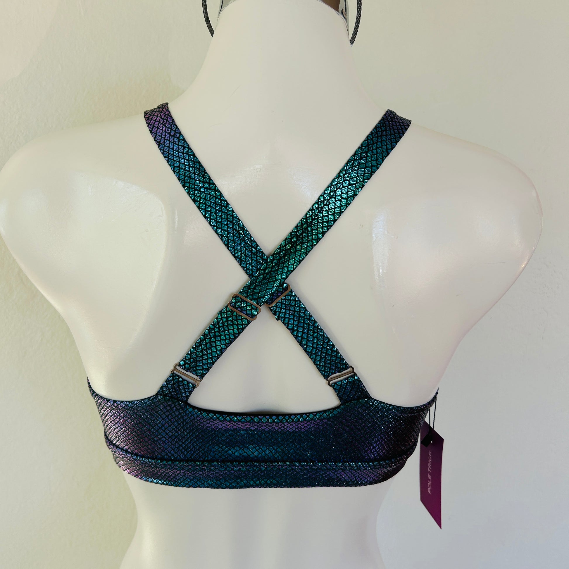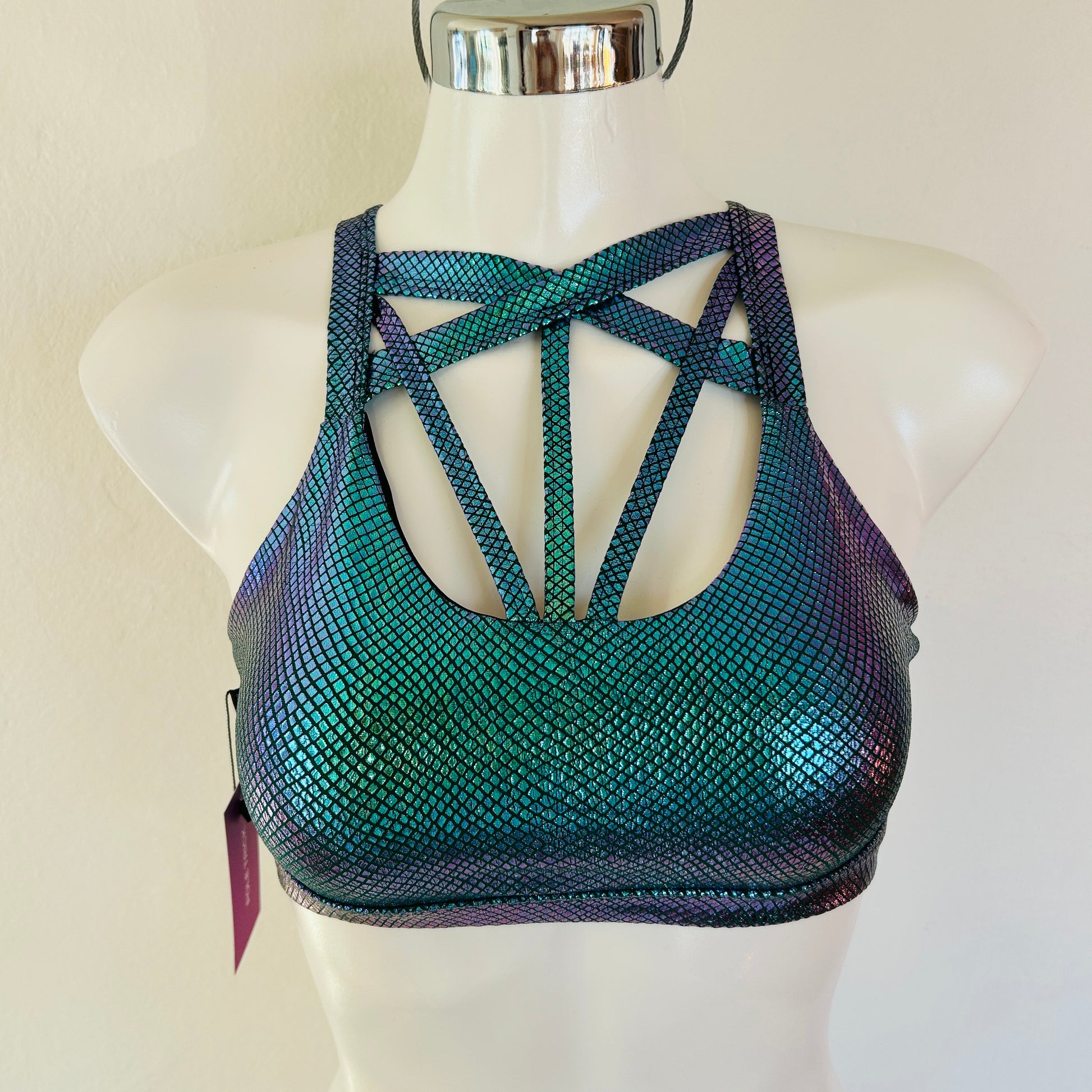 El Top Estrella combina el brillo iridiscente del acabado metálico con un diseño estructural de tiras que realza el pecho y brinda soporte firme.